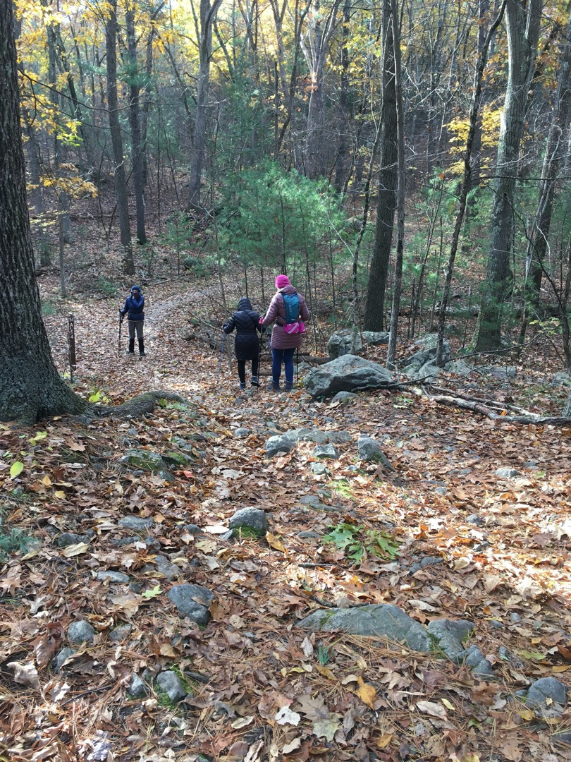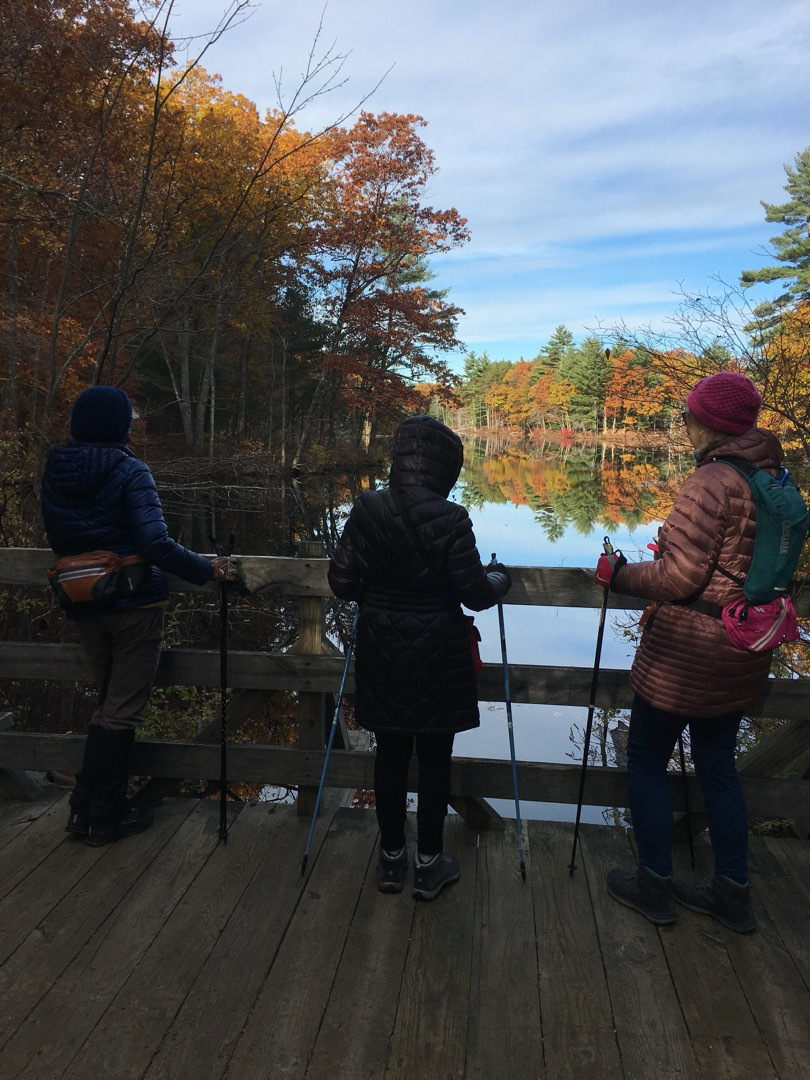 We had a later start, 9:00am. We hiked from Harold Parker State Forest Headquarters to Salem Pond. The foliage was beautiful. The lower spots of the trail were a bit wet which took some creative manuvering. But thank heavens for the Nordic Walking Poles which make such hikes so much easier. The air was sooo very fresh with the deeply satisfying fragrance of Fall. Notes of Apple with a tinge of chocolate and an orange finish :). The sunshine was bright and the forest was flooded with golden and rust-red hues, due to the yet to fall beech and oak leaves. Mood Lifting!!!