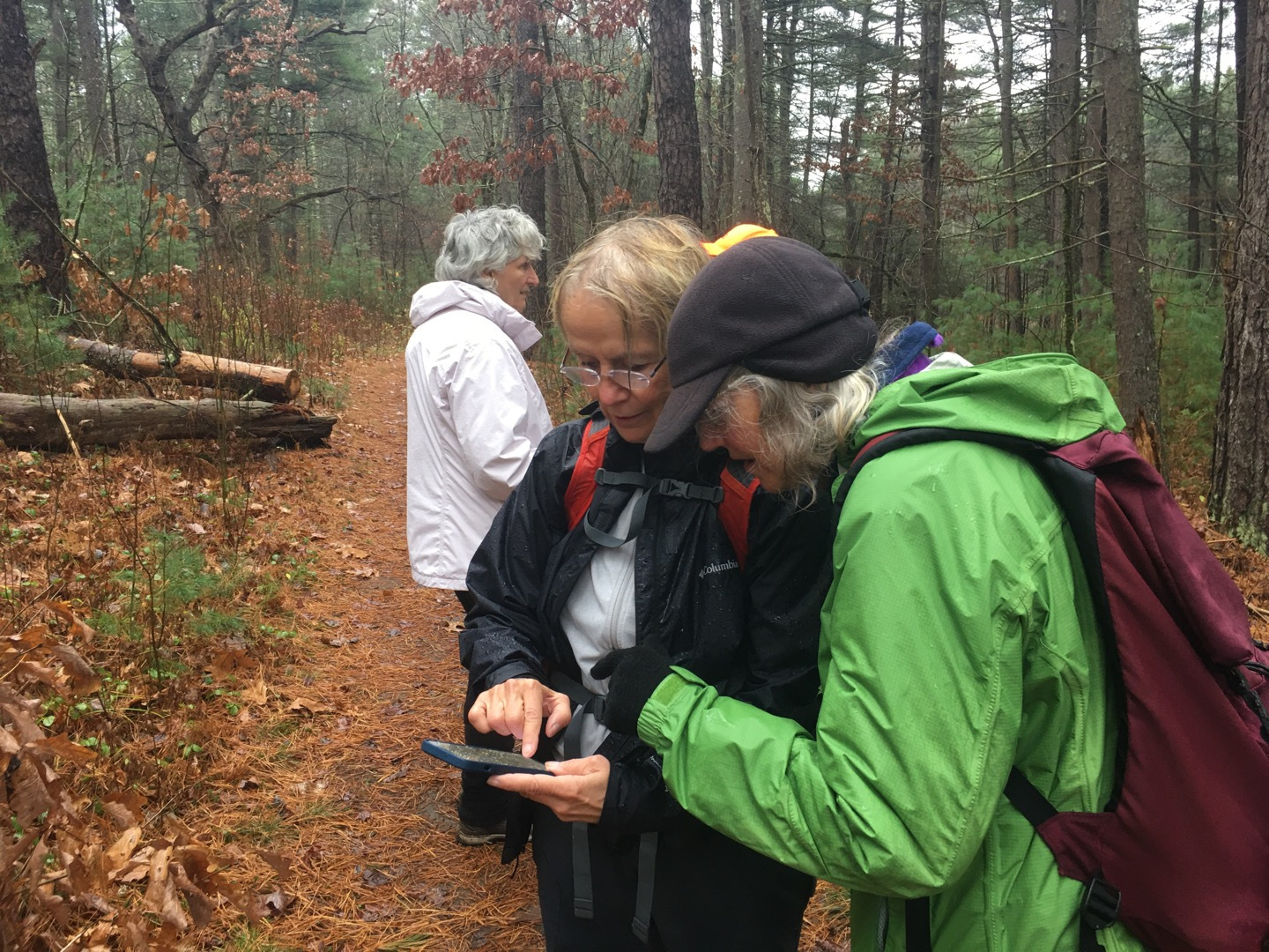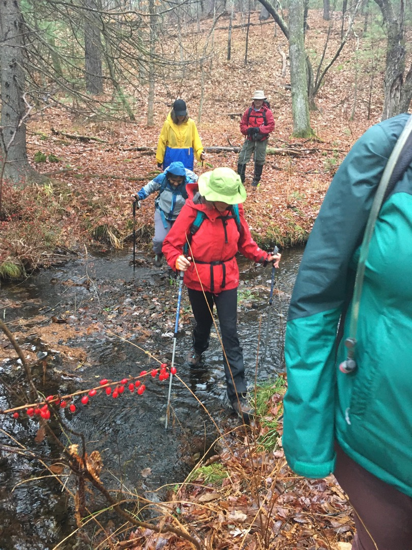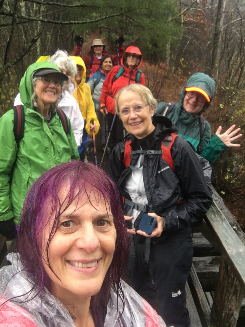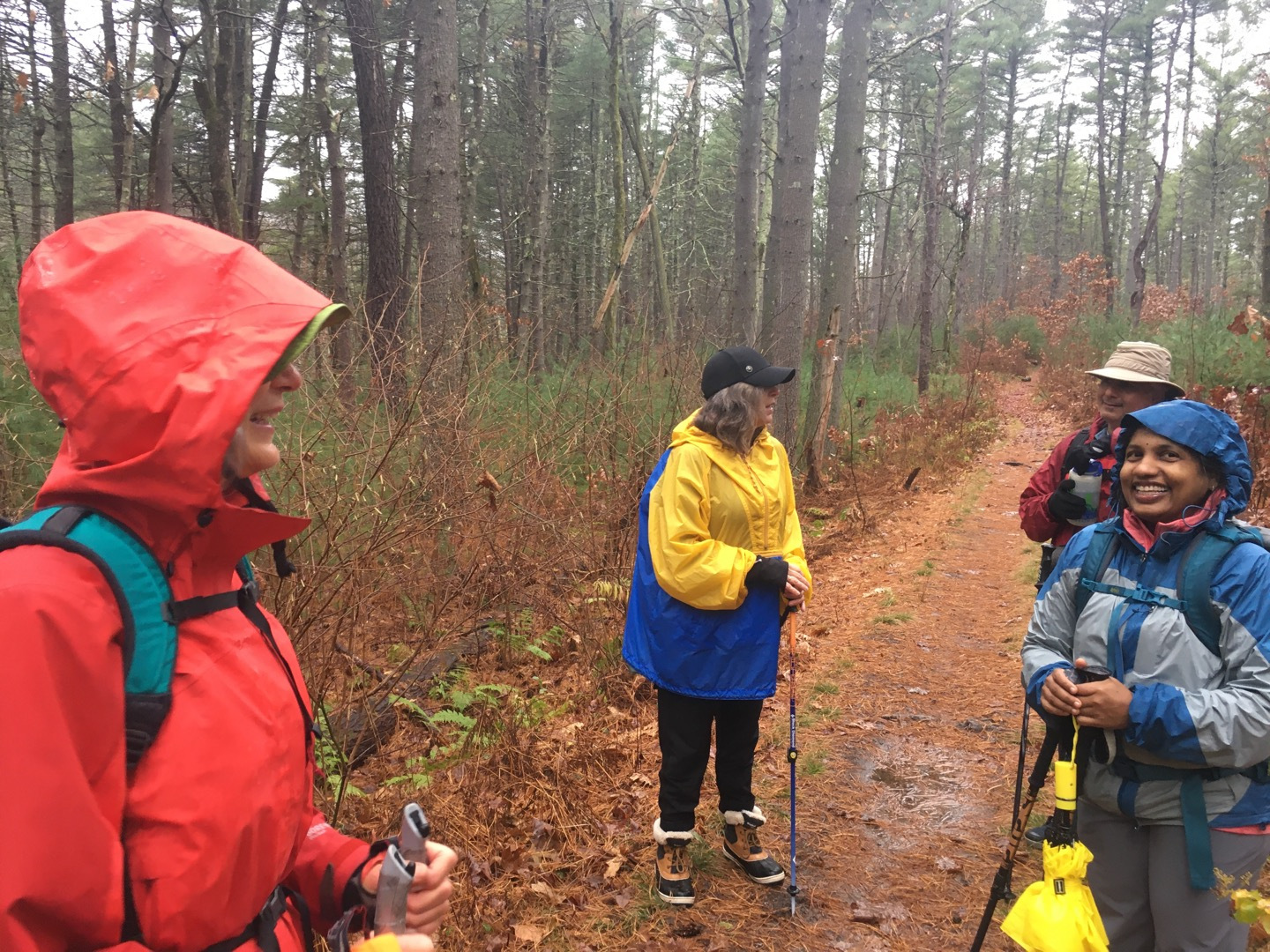 Well Denise and I did the actual and real Nordic Walking. The rest of the fine bunch were the hardiest New England women there ever were. We hiked (ahem Nordic Walked!!) about 8.62miles in pouring rain for about 4hours. Yes, as hardy as they come. This was a vigorous hike led by our fearless leader Connie. The rain was a very light shower which poured every now and then. It did not really faze anyone in the group. Two hours in, we stopped and ate our lunches, yes, in the rain. The rain brings an entirely different outlook to any hike. The contrasts between the wet and the dry is a sight to behold. Of course it is important to have good gear to keep oneself dry.
