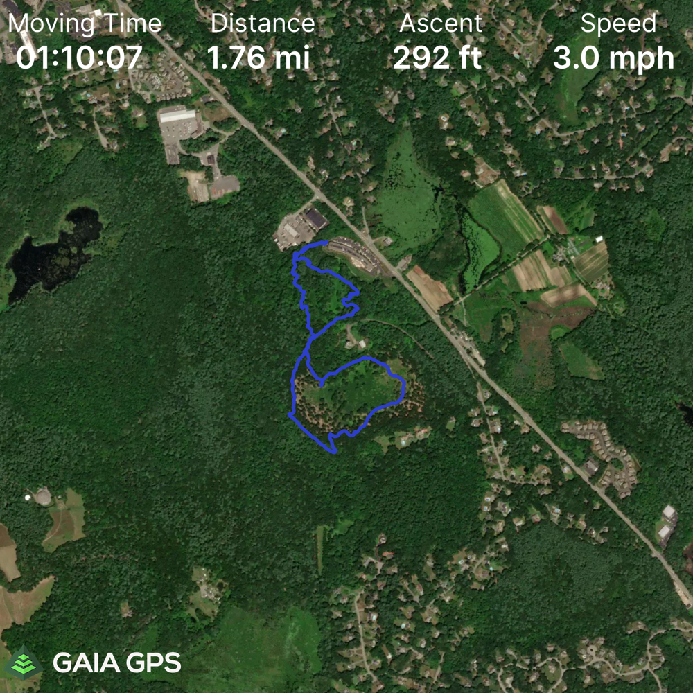 It was a great Hike, beginning at the North-East Section of the Ward Reservation. The trail starts at the back side of Brightview Senior Living. It meanders alongside a decently steep hill, eventually reaching Elephant Rock. This part of the Trail is actually Conservation Land in North Andover and is maintained by Friends of North Andover Trails (also referred to as FONAT, see https://map.fonat.org/?destination=ward). We eventually took the Vetter Trail to the Blue Dot Trail, to the Middle Trail and back to the original trail to make a round-trip vigorous Nordic-Walk of about 1.76 miles in about 90mins (See Included Trail picture).